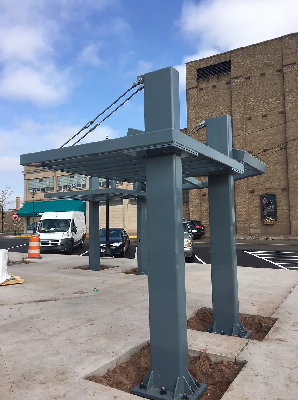 AKRO Engineering & Design provided full structural engineering design for U.P. Fabricators, including all steel framing, connections, and foundations for a new outdoor stage and pergola. The project incorporated unique design elements such as moment-resistant spread footings, cantilevered shade structures, and concealed HSS connections for a clean, architectural finish.